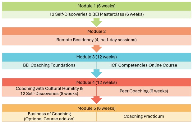In order to graduate from the EICC program, participants must complete all required program elements and coursework, including watching back any sessions missed and submitting a summary of insights. While all sessions are recorded, please bear in mind, participants must be present for 50% of the live, remote sessions (synchronous) as per ICF guidelines.